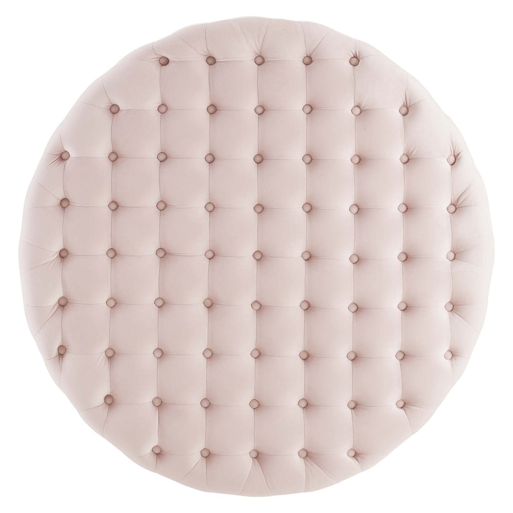 Revive decor in your living space with the Ensconce Tufted Performance Velvet Round Ottoman. Rich in tactile luxury and glam deco style, this round ottoman features deep button tufting and gold metal accents, and serves as both a comfortable choice for extra seating space or a unique coffee table in your living room. Covered in soft, stain-resistant performance velvet, this upholstered ottoman is densely padded in foam and rests atop a sturdy gold stainless steel base. Complete with plastic foot caps to protect flooring. Weight Capacity: 300 lbs.