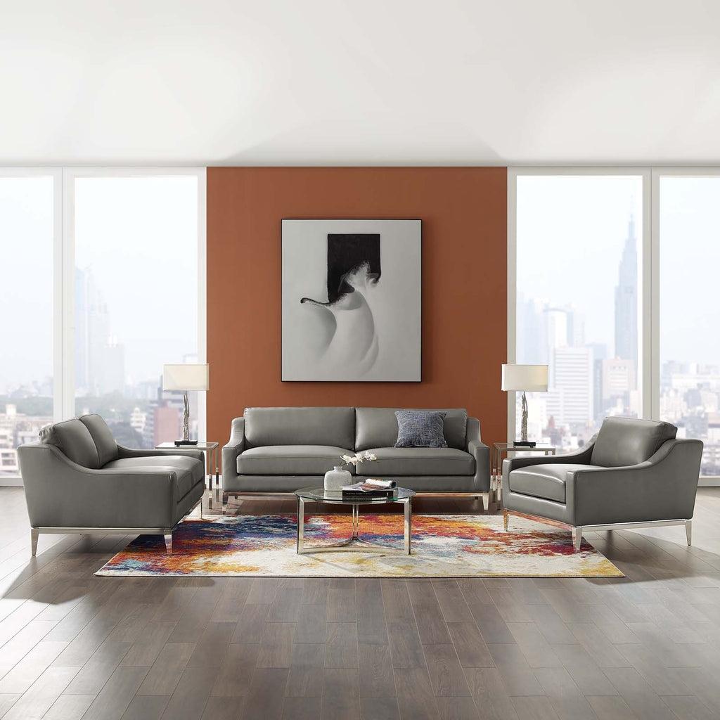 Center your space with the Harness 3 Piece Set which includes the Sofa, Loveseat, & Armchair. Featuring soft leather upholstery, Harness comes with dense foam padded seat cushions, supportive cotton-filled back pillows, a sinuous spring support system, and a polished stainless steel frame with non-marking foot caps. Perfect for the living room, meeting room or recreation area, this set fuses modern intrigue with timeless appeal for a sleek low-profile couch that completes the look of any vintage or contemporary modern home or apartment. Cushions remove for easy cleaning.