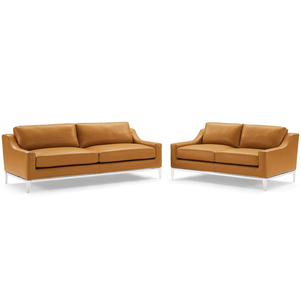 Center your space with the Harness Sofa and Loveseat Set. Featuring soft leather upholstery, Harness comes with dense foam padded seat cushions, supportive cotton-filled back pillows, a sinuous spring support system, and a polished stainless steel frame with non-marking foot caps. Perfect for the living room, meeting room or recreation area, this set fuses modern intrigue with timeless appeal for a sleek low-profile couch that completes the look of any vintage or contemporary modern home or apartment. Cushions remove for easy cleaning.