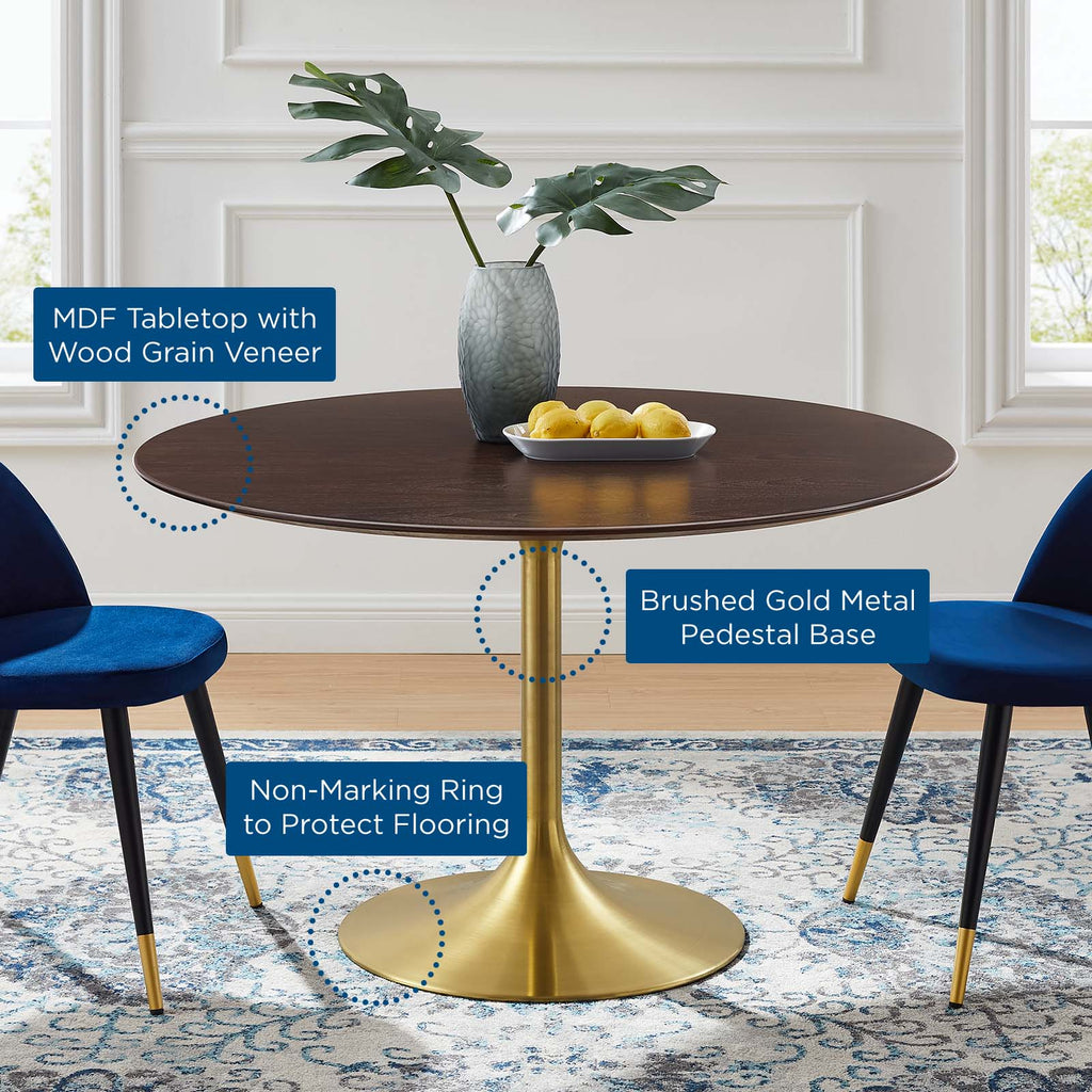 Reflecting a seamless organic shape and timeless form, the Lippa dining table has become a symbol of modernism for over the past 60 years. Before its release, homes were filled with clunky remnants of an industrial age long gone by. But in order to advance into the new world, homes first had to transition from the traditional square table, into a piece that connoted progress. The base and dimensions are true to the original specifications, while the table’s circular MDF top has an easy-to-clean wood grain veneer, and the metal tapered base features a brushed gold finish.