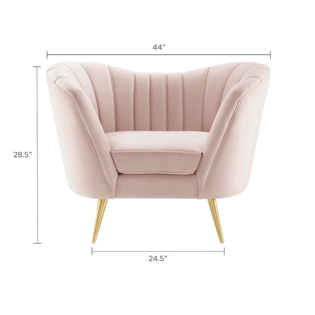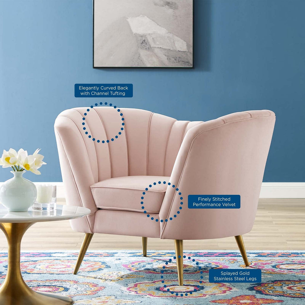 Introduce glam deco appeal with the Opportunity Vertical Channel Tufted Curved Performance Velvet Living Room Lounge Accent Armchair. Featuring a gently rolling silhouette and elegantly curved back, the Opportunity accent chair delivers a luxurious seating experience with soft, stain-resistant performance velvet upholstery, an individually wrapped pocket coil system, and dense foam padding. Complete with a removable seat cushion with a removable seat cushion, this living room armchair features interior vertical channel tufting along the interior, creating a comfortable retro-modern chair for your living room or lounge room. Opportunity's solidly constructed wood frame rests with secure precision on four splayed gold stainless steel legs and supports up to 300 lbs.